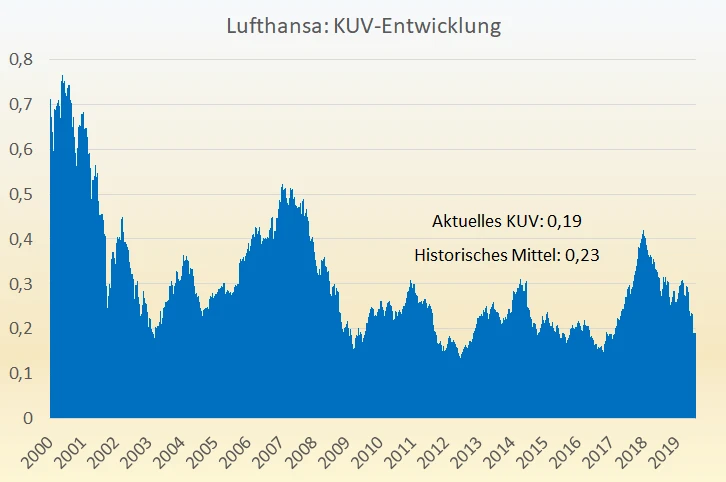 Die folgende Grafik zeigt die historische KUV-Entwicklung der Lufthansa-Aktie. Klar zu erkennen ist dabei, dass sie in ihrer Geschichte immer wieder um einen Wert von 0,2 bis 0,3 oszilliert ist. Der Durchschnitt der letzten zehn Jahre beträgt 0,23. Das laufende KUV beträgt hingegen nur 0,19. Historisch war sie selten günstiger, im Tief 2012 konnte man die Aktie jedoch kurzfristig für ein 0,12er-KUV kaufen. Wenn der Newsflow ins Positive dreht, der Ölpreis mitspielt und die Anlegerstimmung wendet, kann die Aktie auch ohne Weiteres wieder Bewertungen oberhalb eines 0,3er KUVs zugestanden bekommen.