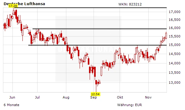 Mit dem Ausbruch über die 15-Euro-Marke setzte die Aktie der Kranich-Airline zuletzt zum Steigflug an. Für Rückenwind sorgten die erfreulichen Verkehrszahlen für den Oktober und die schnellen Fortschritte beim Effizienzprogramm Score.
