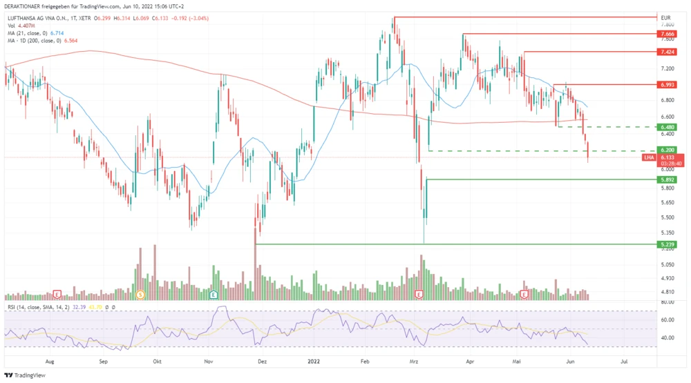 Anlegern gefällt dieser Umstand natürlich nicht und die Lufthansa-Aktie hat seit Monatsbeginn bereits über zehn Prozent verloren. Auch die wichtige Unterstützung am GD200 bei 6,56 Euro konnte den Kursverfall nicht aufhalten. Zum Wochenschluss fiel der Titel nun auch unter den nächsten Support bei 6,20 Euro. Schließt der Markt heute unter dieser Marke, wird ein neues Verkaufssignal ausgelöst und weiterer Abwärtsdruck entsteht.