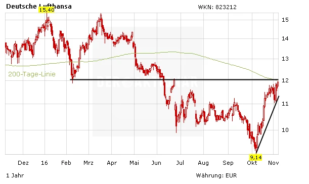 Über mehrere Monate hielt der Abwärtstrend der Lufthansa-Aktie ungebremst an. Seit Anfang Oktober hat der DAX-Titel aber die Wende geschafft. Inzwischen notiert die Kranich-Airline wieder an der 12-Euro-Marke. Im Fokus steht derzeit das Kräftemessen mit dem irischen Billigfluganbieter Ryanair.