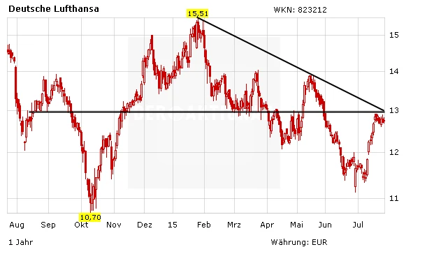Die Lufthansa-Aktie wurde von den Ergebnissen in Frankreich ebenfalls nicht belastet. Vor dem Quartalsbericht am 30. Juli hat DZ-Bank-Analyst Dirk Schlamp derweil seine Einschätzung für den DAX-Konzern überarbeitet. Der Experte rechnet mit einem soliden Quartalsbericht der Fluggesellschaft. Vor allem der fallende Ölpreis sollte Auftrieb geben. Allerdings bestehe das Risiko weiterer Pilotenstreiks, die im wichtigen, laufenden Sommerquartal besonders negativ wären. Den fairen Wert der Aktie sieht Schlamp bei 13,50 Euro. Seine Empfehlung lautet weiterhin „Halten“.