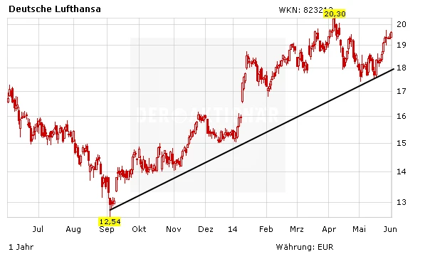 Lufthansa befindet sich mit dem Sparprogramm Score auf einem guten Weg. Dank des Programms soll der operative Gewinn bis zum Jahr 2015 auf 2,65 Milliarden Euro steigen. Für 2014 rechnet das Management mit einem Ergebnis von 1,3 bis 1,5 Milliarden Euro. Investierte Anleger bleiben dabei und sichern ihre Position mit einem Stopp bei 16 Euro ab. Das Kursziel lautet 22 Euro.