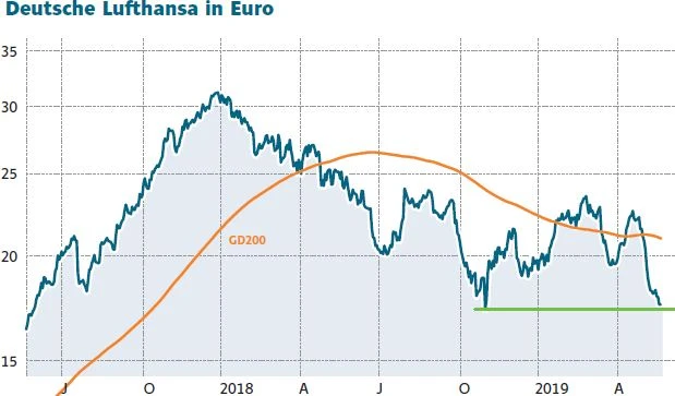 Die Aktie der Lufthansa ist nach ihrem jüngsten Sinkflug an eine enorm wichtige Unterstützung heran gelaufen: Das Novembertief 2018 bei 17,05 Euro. Dieses gilt es nun, unbedingt zu verteidigen, soll sich das charttechnische Bild nicht weiter eintrüben. Ein positives Signal würde hingegen die Rückeroberung der 200-Tage-Linie bringen, die derzeit bei rund 21 Euro verläuft.