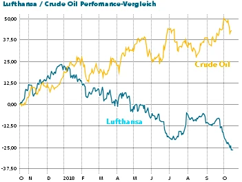 Steigende Ölpreise spiegeln sich häufig negativ in der Erfolgsrechnung der Fluggesellschaften wieder. Fakt ist jedoch, dass die Lufthansa im laufenden Jahr wie kaum eine andere Airline mit knapp 78 Prozent gegen höhere Kerosinkosten abgesichert ist. Steigt der Ölpreis um fünf Dollar, führt das zu einem marginalen Rückgang des Konzern-EBIT um 1,5 Prozent. Doch die Angst vieler Anleger vor langfristig steigenden Ölpreisen überwiegt trotzdem. Der nachfolgende Vergleich zeigt, dass sich in der Vergangenheit steigende Rohöl-Preise trotz Absicherungen tendenziell negativ auf die Lufthansa-Aktie auswirkten.