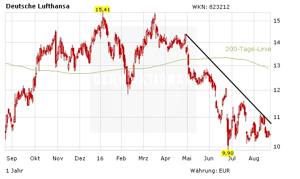 Das Bild bei der Deutschen Lufthansa bleibt eingetrübt. Nach wie vor notiert der DAX-Titel nur knapp oberhalb des Jahrestiefs bei 9,90 Euro. Der Sprung über den Abwärtstrend lässt weiter auf sich warten. Um den Konzern wieder in die richtige Spur zu führen, könnte es bei der Kranich-Airline zu weiteren Umstrukturierungen kommen.