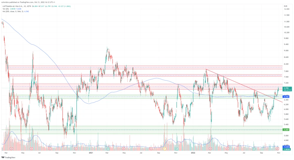Die Aktie der Lufthansa hat Mitte Oktober starke Kaufsignale generiert, die ihr weiteren Auftrieb bescherte. So schaffte sie den Sprung über den Kreuzwiderstand, in dem die Abwärtstrendlinie bei 6,45 Euro und die Widerstandszone zwischen 6,45 und 6,60 Euro zusammengetroffen sind. Damit bezwang sie auch gleichzeitig den GD200 bei 6,54 Euro.