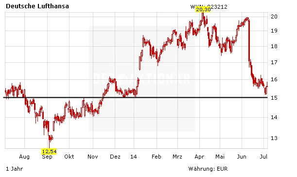 Seit der Prognosekürzung Anfang Juni ist die Aktie massiv unter die Räder gekommen. Die charttechnische Situation der Lufthansa-Aktie hat sich durch den Kurssturz massiv eingetrübt. Im Zuge der Abwärtsbewegung wurden mehrere Unterstützungen nach unten durchbrochen. Der nächste Widerstand wartet bei 15 Euro. Auch wenn sich die Aktie zuletzt stabilisiert hat, sollten Anleger vorerst die Finger von der Aktie lassen.