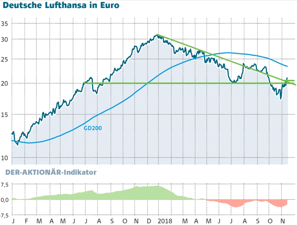 Denn die Papiere der Kranich-Airline haben sowohl die charttechnisch wichtige Marke bei 20,00 Euro als auch das Zwischenhoch bei 20,41 Euro überspringen können. Geholfen haben dürfte dabei die gestrige Abkündigung, die Ticketpreise 2019 zu erhöhen. Zudem gab es heute für die Lufthansa-Anteile eine Hochstufung vom Analysehaus Kepler von „Reduce“ auf „Hold“. Darüber hinaus spielt dem DAX-Konzern der jüngste Einbruch der Ölpreise in die Karten.