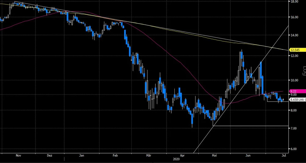 Die Euphorie, die bei der Lufthansa-Aktie im Zuge der Rettung durch den Staat und der Lockerungen rund um den Globus aufgekommen war, ist mittlerweile wieder verflogen. Der Aufwärtstrend wurde gebrochen und der Aktienkurs hatte zuletzt gegen den Markttrend deutlich nachgegeben. Nun befindet sich der MDAX-Titel erneut aus charttechnischer Sicht in einem sehr wichtigen Bereich.