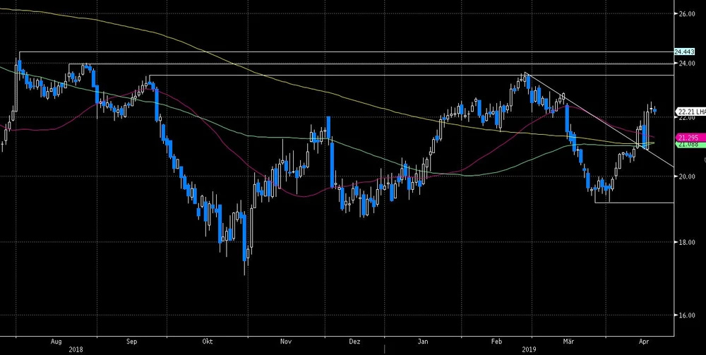 Nachdem der Ausbruch aus dem kurzfristigen Abwärtstrend geglückt ist, stehen die Chancen nun gut, dass der DAX-Titel den Widerstand von 23,66 Euro ins Visier nimmt. Sollte dies gelingen, lauern allerdings bei 24,00 Euro sowie 24,45 Euro gleich die nächsten Hürden.
