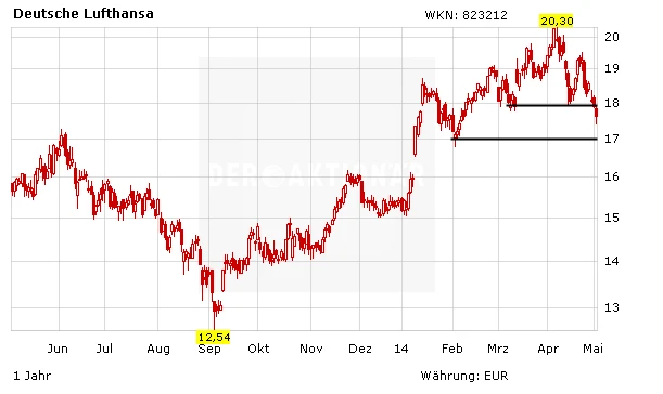 Im frühen Handel notiert die Lufthansa-Aktie stärker. Gelingt der nachhaltige Anstieg über die 18-Euro-Marke, hellt sich die charttechnische Situation auf. Investierte Anleger bleiben dabei und beachten den Stopp bei 16 Euro.