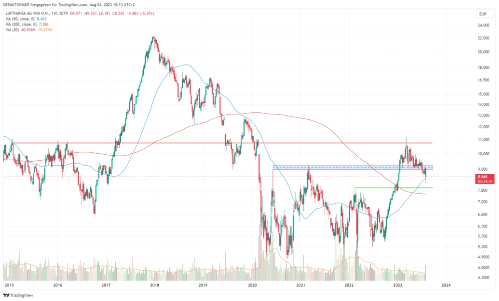 Nach der steilen Erholungsrally zwischen Oktober und März prallte die Lufthansa-Aktie an der Widerstandszone um 10,80 Euro ab. Daraufhin folgte eine Konsolidierung zwischen diesem Bereich und den Unterstützungen an den Zwischenhochs bei 8,96 und 9,25 Euro. Nachdem die beiden Supports während der letzten viereinhalb Monate gehalten haben, rutschte die Aktie nun infolge des negativen Newsflows darunter.