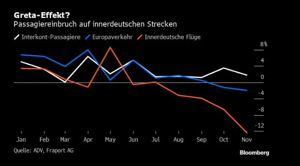 Das sind Zahlen die Greta Thunberg sicherlich gefallen dürften: Im November ist der innerdeutsche Flugverkehr um stattliche elf Prozent zurückgegangen. Dies hängt natürlich auch an diversen anderen Sondereffekten, dennoch scheint sich daraus – ähnlich wie in Schweden allmählich ein Trend herauszubilden.