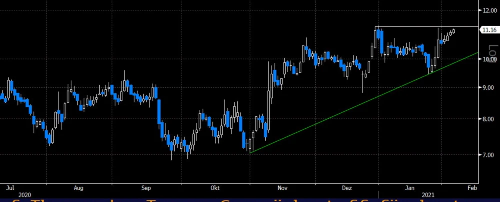 Sollte hingegen auch der dritte Anlauf scheitern, die Marke von 11,31 Euro zu überspringen, wäre es zumindest wichtig, dass der seit Oktober intakte Aufwärtstrend, der aktuell bei knapp 10 Euro verläuft, nicht gerissen wird.