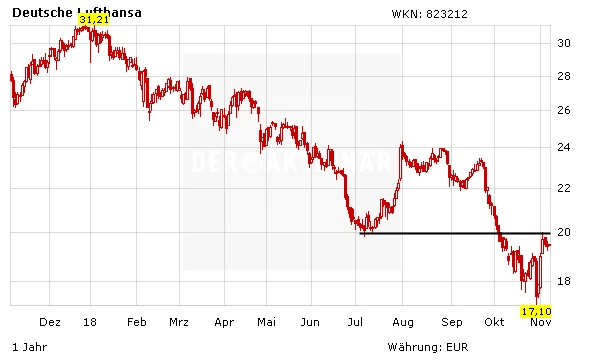 Denn an den vergangenen Handelstagen scheiterten die Anteile der Kranich-Airline daran, die wichtige Marke von 20,00 Euro zurückzuerobern. Im Zuge dessen drehte der Kurs wieder nach unten ab. Nach den vorangegangenen deutlichen Kurszuwächsen von 17,10 auf 20,00 Euro innerhalb weniger Tage ist eine derartige Gegenbewegung natürlich durchaus üblich und auch gesund.