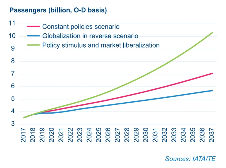 So geht der Airline-Dachverband IATA nach wie vor davon aus, dass sich die Zahl der Flugpassagiere ausgehend vom Jahr 2017 (als noch knapp 3,7 Milliarden Personen pro Jahr mit dem Flugzeug befördert wurden) bis 2037 wohl knapp verdoppeln würde. Im Fall politischen und ökonomischen Gegenwindes würde das Wachstum zwar etwas geringer ausfallen. Sollten sich die Rahmenbedingungen für die Flugbranche hingegen noch weiter verbessern, erwarten die Experten bis 2037 sogar einen Anstieg der jährlichen Passagierzahlen auf mehr als zehn Milliarden.