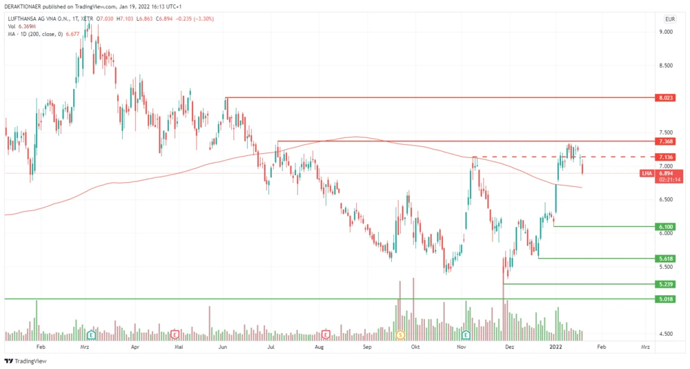 Im Dezember 2021 hellte sich die Stimmung bei der Lufthansa-Aktie auf und der Titel startete vom Jahrestief bei 5,24 Euro einen kräftigen Rebound. Die Bullen meisterten den Sprung über die wichtige 200-Tage-Line bei 6,67 Euro und knackten auch den Widerstand bei 7,14 Euro. Vergangene Woche war dann vorerst Schluss mit der Erholungswelle und der Kurs markierte ein Mehrmonatshoch bei 7,34 Euro.