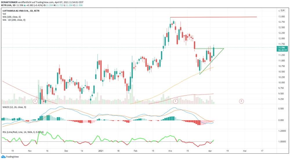 Im Anschluss ging es in den nachfolgenden drei Wochen um bis zu 20 Prozent nach unten. Ende März stoppe der GD100 bei 10,37 Euro den Sturzflug. Nach einigen Tagen der Richtungssuche konnte sich die Aktie fangen und formte ein sogenanntes steigendes Dreieck. Eine technische Formation, welche oft nach oben aufgelöst wird. Auch der MACD und RSL Indikator signalisieren eine weitere Erholung, da Ihre Parameter in den bullischen Bereich zurückkehren.