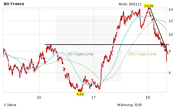 Die Aktie von Air France-KLM verlor am Montag-Vormittag zeitweise mehr als 14 Prozent auf 6,98 Euro und damit auf den Stand von Anfang April 2017. Anleger sollten das Treiben derzeit von der Seitenlinie aus beobachten und abwarten.