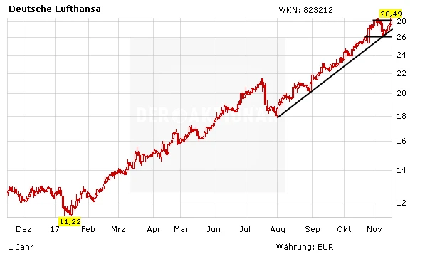 Die Perspektiven für die Lifthansa bleiben gut, die Bewertung ist mit einem KGV von 7 immer noch günstig und das Chartbild weiterhin sehr stark. Zwar besteht zweifellos immer wieder die Gefahr von deutlichen Korrekturen im Zuge von Gewinnmitnahmen, dennoch können mutige Anleger hier weiterhin zugreifen. Der Stopp sollte bei 21,00 Euro belassen werden.