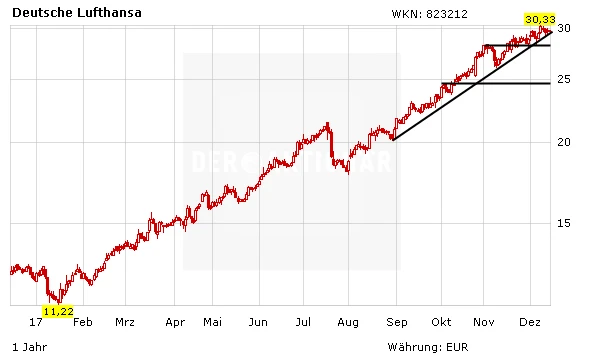 Dass die Lufthansa Niki nicht retten kann beziehungsweise darf, ist natürlich sehr schade für die rund 1.000 Niki-Mitarbeiter (und wohl auch für den Steuerzahler, da das KfW-Darlehen für Air Berlin damit womöglich nicht vollständig zurückgezahlt werden kann). Die Lufthansa kann die wenig überraschende Entwicklung aber durchaus gut verdauen. Die Marktmacht der Kranich-Airline bleibt hoch, die Aussichten gut und die Bewertung mit einem 2018er-KGV von gerade einmal 7 niedrig. Anleger sollten daher weiterhin an Bord bleiben (Stopp: 23,60 Euro).