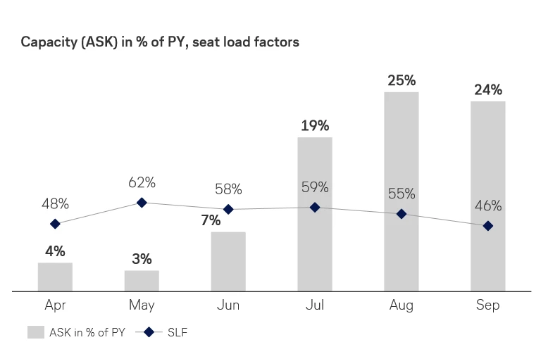 Angesichts der schwachen Ticketnachfrage und der schwachen Auslastung (siehe Grafik) wegen der Corona-Pandemie will der Konzern im vierten Quartal weiterhin höchstens ein Viertel der Vorjahreskapazität anbieten. Der Vorstand um Lufthansa-Chef Carsten Spohr will den Mittelabfluss im operativen Geschäft im vierten Quartal auf 350 Millionen Euro begrenzen. Im Laufe des nächsten Jahres soll der operative Mittelzufluss wieder ins Positive drehen. Dazu müsse sich die Pandemie aber so entwickeln, dass der Konzern sein Flugangebot wieder auf rund 50 Prozent des Vorkrisenniveaus hochfahren kann. Zur kompletten Unternehmensmeldung.