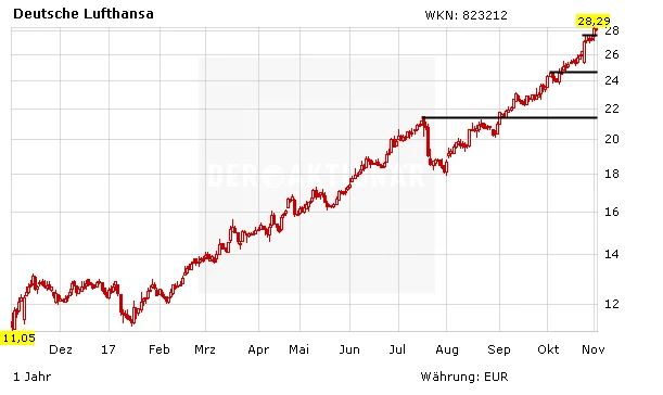 Die Lufthansa setzt nach dem Aus von Air Berlin nun sogar Jumbo-Jets auf innerdeutschen Strecken ein, um die hohe Nachfrage zu bedienen. Dies und viele weitere erfreuliche Entwicklungen bescheren der Kranich-Airline natürlich üppige Gewinne. Kein Wunder, dass der Aktienkurs nun auf ein neues Allzeithoch geklettert ist.