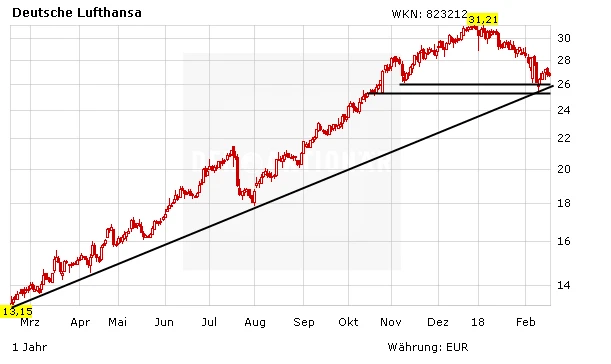 Trotz der zuletzt zahlreichen guten Meldungen und den anhaltend guten Geschäftsperspektiven verharrt die Lufthansa-Aktie weiter im – aus charttechnischer Sicht durchaus gesunden – Konsolidierungsmodus. Heute legt der Kurs nur leicht zu, während der DAX fast ein Prozent hinzugewinnt. Dies dürfte aber auch am Konkurrenten Air France KLM liegen, dessen Anteile nach Q4-Zahlen zum Handelsstart in Paris deutlich unter Druck gerieten.