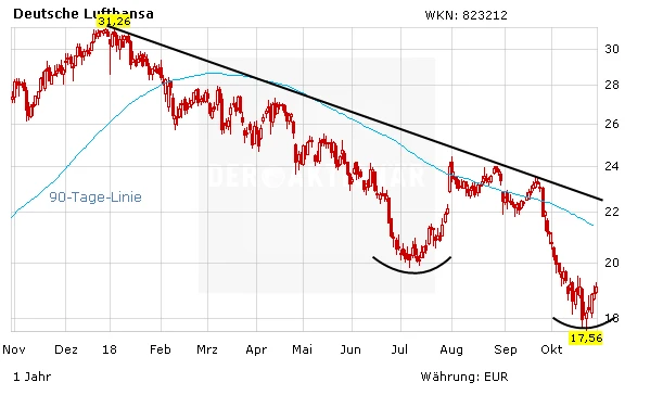 Die Aktie der Lufthansa ist angesichts der mittel- bis langfristigen guten Perspektiven und der günstigen Bewertung sehr attraktiv. Doch noch ist trotz der jüngsten Kurserholung kein nachhaltiger Boden ausgebildet worden, der Abwärtstrend seit Jahresanfang ist intakt. Möglicherweise bildet sich auch eine umgekehrte Schulter-Kopf-Schulter-Formation heraus, die eine Trendumkehr einleiten würde. Für Anleger besteht daher derzeit noch kein Handlungsbedarf, den DAX-Wert wieder zu kaufen.