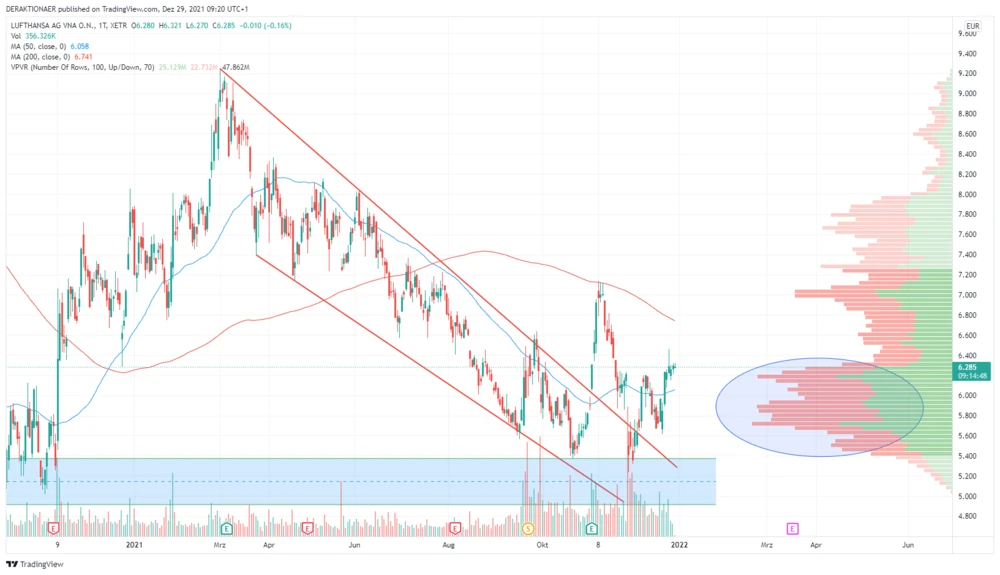 Lufthansa hat noch immer stark unter pandemie-bedingten Problemen zu kämpfen. Auch wenn die Prognosen für 2022 besser werden, ist eine schnelle Besserung der Situation bei Privat- und Geschäftsreisenden aufgrund der anhaltenden Reisebeschränkungen nicht in Sicht. Das spiegelt sich auch deutlich im Chartbild wider.