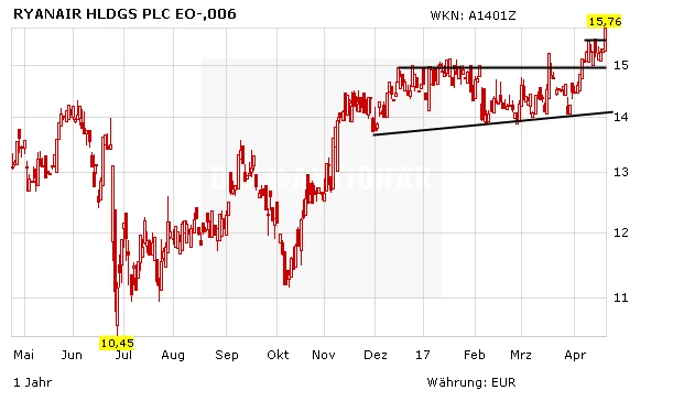 DER AKTIONÄR rät Anlegern weiterhin dazu, im Airline-Sektor auf die Aktie des irischen Billigfliegers Ryanair zu setzen. Der Konzern wächst stark und ist hochprofitabel. Zudem hat der Kurs nun durch den Sprung auf ein neues Allzeithoch ein Kaufsignal generiert. Bereits investierte Anleger sollten den Stoppkurs zur Gewinnsicherung auf 12,50 Euro nachziehen.