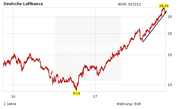 Indes erholt sich die Aktie wieder von dem deutlichen Kursrücksetzer der vergangenen Handelswoche. Dieser war angesichts des stark gestiegenen Kurses fast schon überfällig und ist aus charttechnischer Sicht auch durchaus als gesund zu werten. Da dadurch keinerlei wichtige Unterstützungen gerissen worden sind und der Aufwärtstrend weiter intakt ist, bleibt die Aktie aussichtsreich (mehr dazu unter: Lufthansa: 5 Gründe für den Kauf).