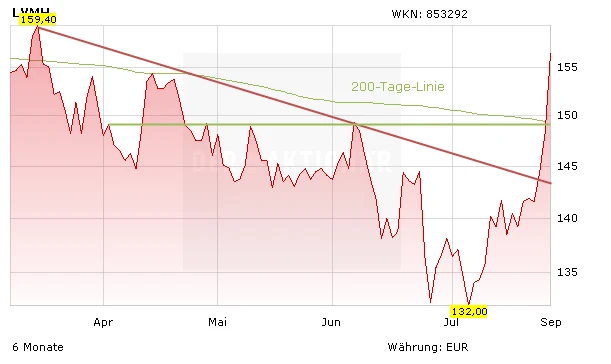 Das charttechnische Bild der LVMH-Aktie hat sich durch den konstanten Kursanstieg seit Anfang Juli weiter aufgehellt. Der Sprung über die Widerstandsmarke bei 149 Euro war wichtig, um nachhaltig nach oben zu laufen. Die nächste Hürde ist das Hoch von Mitte März bei 159,40 Euro.