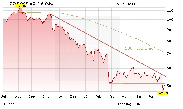 Die Aktien von Kering und Hugo Boss wurden im Zuge des Brexit-Kursrutsches bei 139 Euro beziehungsweise 48 Euro zwar ausgestoppt, dennoch ist von den drei Aktien nach Einschätzung des AKTIONÄR Hugo Boss noch am attraktivsten bewertet. Anleger sollten eine Beruhigung der Lage abwarten, bevor sie neue Positionen eingehen. Der nächste Widerstand liegt bei 51,60 Euro. Noch investierte Anleger bleiben investiert.
