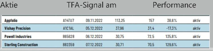 Nicht jedes TFA-Signal schlägt so ein, doch die beiden Beispiele zeigen, dass die selbstentwickelte Chartfformel oft zum genau richtigen Zeitpunkt Geheimtipp-Aktien herausfiltert. Jetzt gibt es wieder drei neue Chancen – eine davon wandert in der neuen Ausgabe 26/2023 direkt ins TFA-Depot.