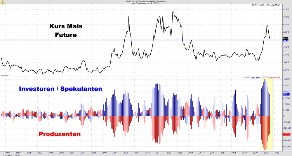 Die Volatilität ist im Mais-Future in den letzten Wochen stark angestiegen. Zuerst über sieben Prozent Plus am 30. Juni, drei Tage später dann über sieben Prozent Minus. Aktuell handelt der Dezember-Kontrakt bei 536 Cent. Der Markt benötigt nun eine sehr gute Ernte um weitere Engpässe zu vermeiden.
