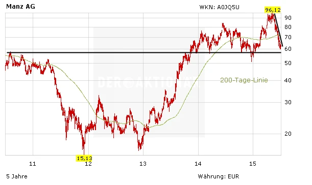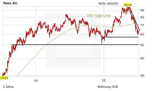 Auch wenn die Manz-Aktie sich von den vorbörslichen Verlusten erholt hat und mit rund drei Prozent im Plus notiert, bleibt DER AKTIONÄR weiterhin vorsichtig. Denn der Abwärtstrend ist weiterhin intakt. Der empfohlene Stoppkurs des AKTIONÄR von 70,00 Euro hat sich als richtig erwiesen. Für einen Neueinstieg sollten Anleger eine Bodenbildung abwarten. Diese könnte im Bereich von 50 oder 55 Euro stattfinden.