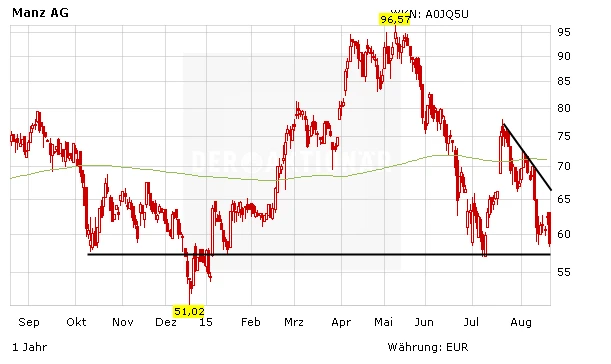 Kurstreibende Neuigkeiten gab es für die Manz-Aktie heute keine. Grund für den Kursrutsch war vor allem das schwache Marktumfeld. Der TecDAX verlor am frühen Morgen knapp zwei Prozent. Der gestrige Kursgewinn der Aktie des Maschinenbauers wurde wieder verloren. Für Anleger rückt durch den Rücksetzer der Widerstand bei 57 Euro in den Fokus. Sollte diese Marke gerissen werde, könnte es noch deutlich weiter nach unten gehen.