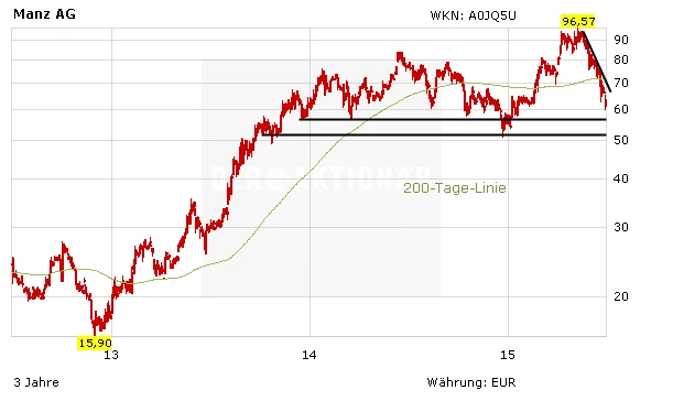 Zuvor hatte Manz noch mit einem Umsatz von 320 bis 340 Millionen Euro und einem deutlich positiven Ebitda gerechnet. Die Manz-Aktie geriet im nachbörslichen Handel unter Druck - die Aktie verlor mehr als fünf Prozent und geht heute mit 58,00 Euro in den Handel.