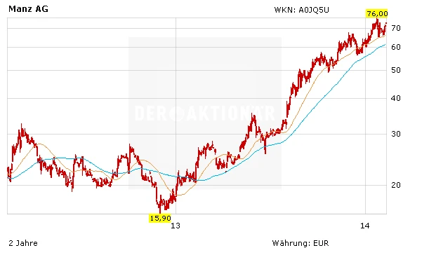 Die Manz-Aktie zeigt zuletzt in einem nervösen Gesamtmarkt relative Stärke. Aus fundamentaler Sicht wird die Luft angesichts eines 2014er-KGVs von 28 jedoch dünner. Gewinne laufen lassen – Neueinsteiger springen jedoch nur mit engem Stopp auf!