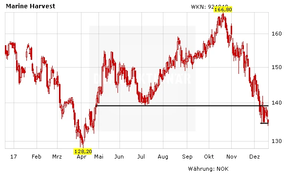 Viele Investoren wenden sich daher vorsichtshalber von den Aktien der Lachsfarmbetreiber wie etwa Marine Harvest ab. Dies lässt sich auch beim Blick auf das Chartbild erkennen. So hat der Kurs erneut ein weiteres Zwischentief nach unten durchbrochen.