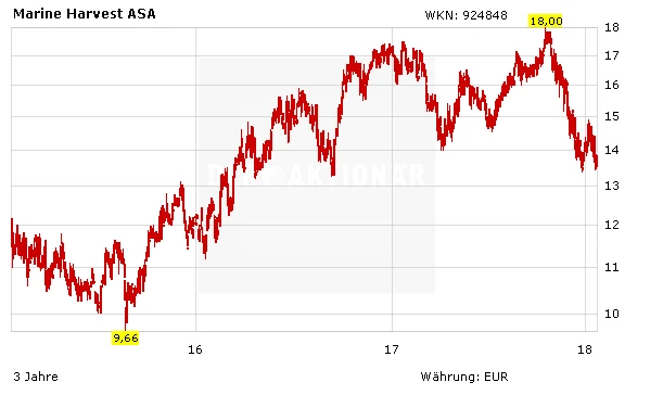 Für das Schlussquartal 2017 hat Marine Harvest in einem Trading-Update bereits einige Eckdaten bekannt gegeben. Demnach dürfte das EBIT im Jahresvergleich um 32 Prozent auf 177 Millionen Euro geschrumpft sein. Der operative Gewinn pro Kilogramm sank um 31 Prozent auf 1,78 Euro.