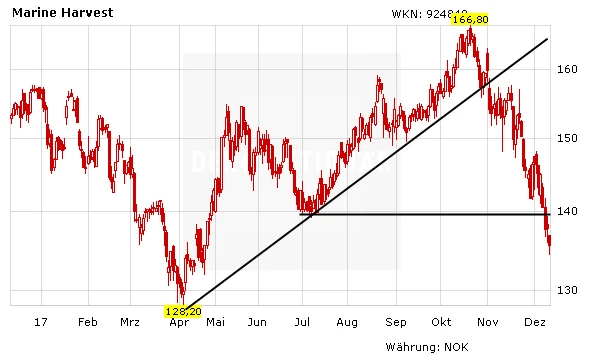 Im Zuge dessen korrigierten auch einige Analysten ihre Gewinnprognosen nach unten und wurden bei den Einschätzungen für die Aktie vorsichtiger. Zudem verringerte der Fonds DNB Norge Selektiv III den Bestand anm Marine-Harvest-Anteilen um 14 Prozent. Dies belastete den Aktienkurs natürlich zusätzlich. Dadurch hat sich natürlich auch das Chartbild erheblich eingetrübt. So ist der langfristige Aufwärtstrend gerissen worden. Auch einige andere wichtige Unterstützungen – zuletzt ein Support im Bereich der 140-Kronen-Marke – konnten der Aktie keinen Halt geben.