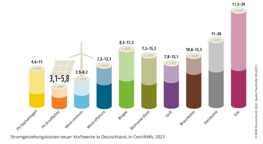 Die Grafik zeigt: Schon heute ist Solar auf dem Dach eine der günstigsten Quellen für die Stromversorgung.