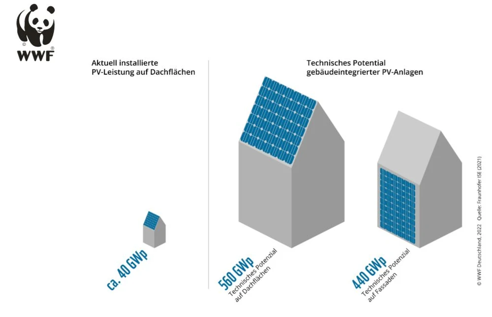 Die Forderung des WWF: Die bundesweit einheitliche Solarpflicht sollte ab 2024 auf Dächern sämtlicher Neubauten gelten. Ab 2026 folgt der Bestand von öffentlichen und gewerblichen Gebäuden, ab 2028 alle Bestandsgebäude in Deutschland. Um das Potential von Dachflächen möglichst auszuschöpfen, sollten mindestens 75 Prozent für die Installation von Photovoltaikanlagen vorgesehen werden.