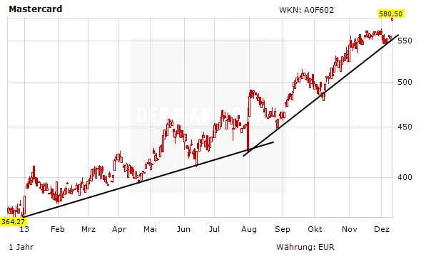 Die Mastercard-Aktie hat seit dem Börsengang 2006 1.900 Prozent zugelegt. Die höhere Dividende ist nur ein Grund, die Aktie zu kaufen. Die Geschäftsaussichten sind sehr gut. DER AKTIONÄR sieht das Kursziel bei 720 Euro. Der Stopp sollte auf 470 Euro angehoben werden.