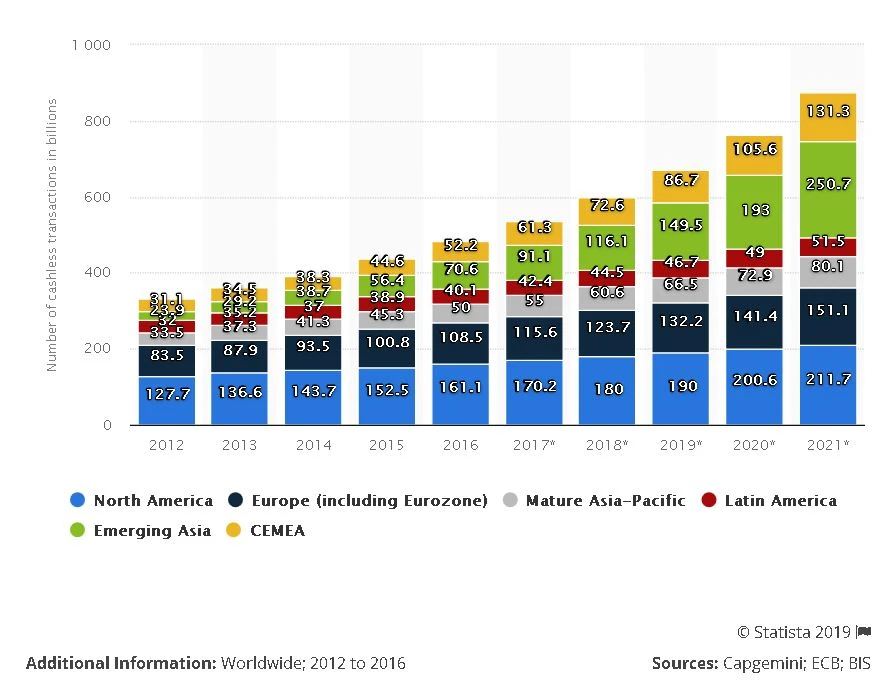 Die Chancen, dass sich der Aufwärtstrend fortsetzt, stehen gut. Bargeldzahlungen kommen immer mehr aus der Mode, wie eine Studie von Capgemini zeigt. Im Jahr 2021 wird die Zahl der elektronischen Transaktionen auf 870 Milliarden steigen. 2012 waren es gerade einmal 330 Milliarden Transaktionen.