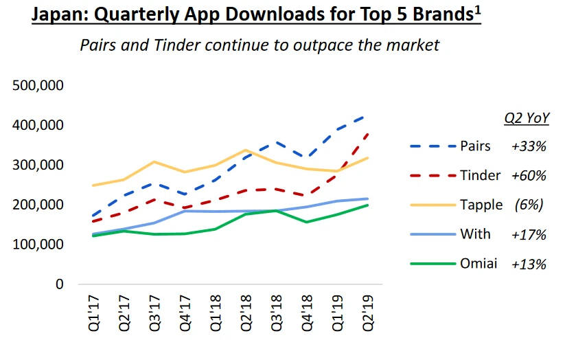 Auf der einen Seite stehen in Asien die entwickelten Märkte wie Japan und Südkorea. In Japan erzielte Tinder beispielsweise im zweiten Quartal einen Download-Zuwachs von 60 Prozent und liegt mit knapp 400.000 Downloads deutlich über den Konkurrenten Tapple oder Omiai.