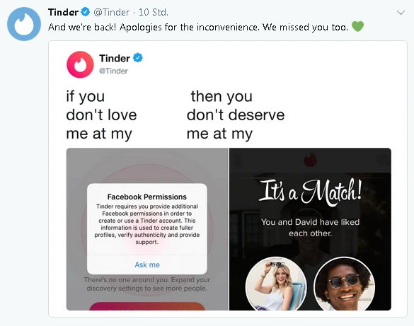 Der Tinder-Entwickler Match Group bekommt die Auswirkungen rund um den Facebook-Datenklau zu spüren. Nachdem Facebook, als Reaktion auf die Ereignisse, den Zugang für Dritte auf die persönlichen Daten eingeschränkt hatte, war es Tinder-Nutzern in den USA nicht mehr möglich sich bei der App anzumelden. Was folgte war eine Flut an Tweets, welche der der Tinder Twitter-Account mit dem Versprechen, das Problem zu lösen, zu beschwichtigen versuchte. Wenige Stunden später gelang es den Verantwortlichen das Problem aus der Welt zu schaffen, und die App wieder zum Laufen zu bringen.