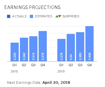 Die rasante Kursentwicklung der Match Group zeigt die zunehmend steigende Nachfrage nach Datingplattformen. Demnach verteuerten sich die Papiere der Tinde-Aktie innerhalb eines Jahres um mehr als 120 Prozent und markierten im März ein Allzeithoch von 38,88 Euro. Für das Geschäftsjahr 2018 will die Match Group noch höher hinaus, was auch die Schätzungen für die Ergebnisse je Aktie für die nächsten Quartale zeigen.